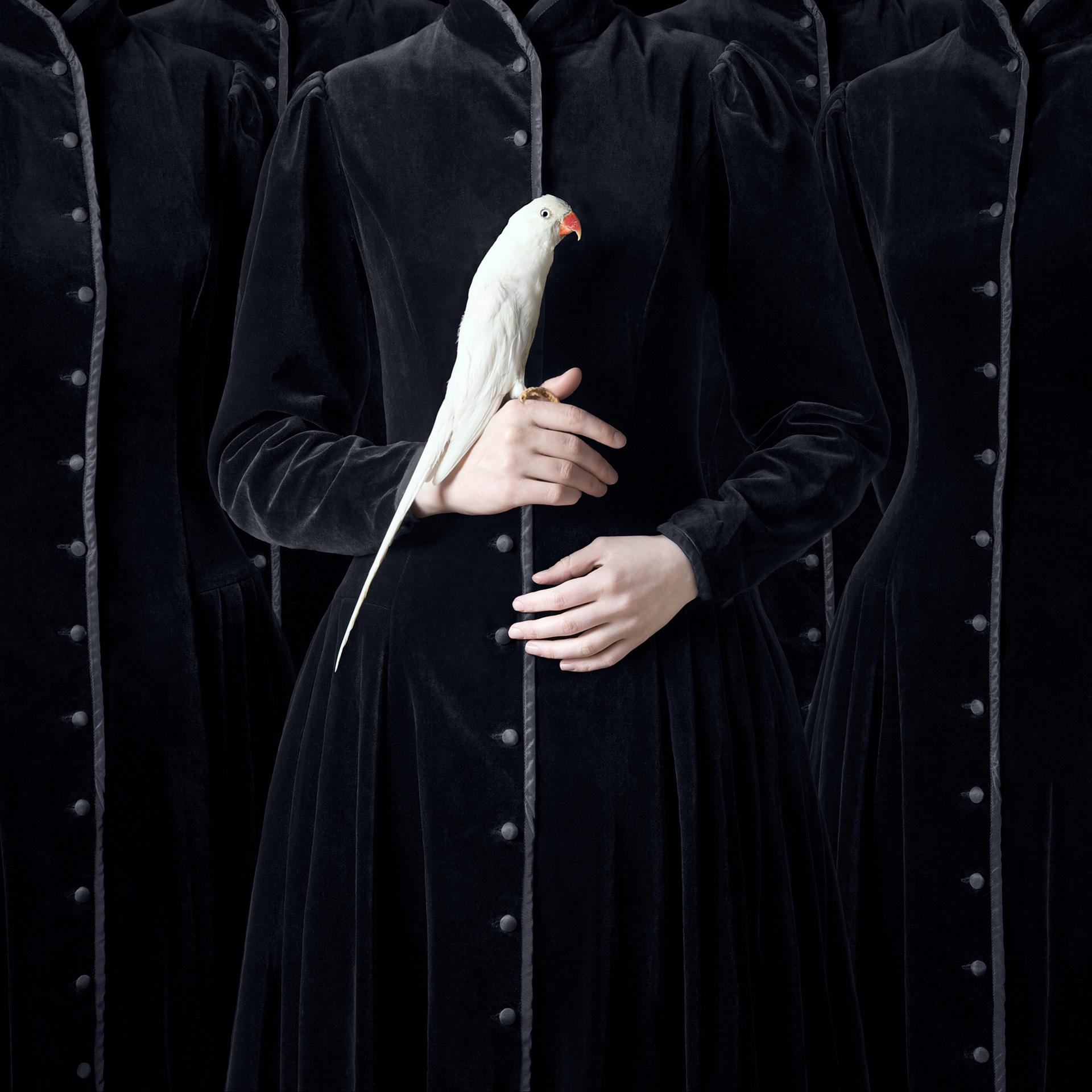This character is a collector, a classifier, an organizer, who tends to understand and defy the inexorable circle of life. The spectral and androgynous figure, wrapped in black velvet, takes us on a calm but impossible quest. Through these searches and failures, the photographer possibly invites us to question our own fragile and unstable human condition.